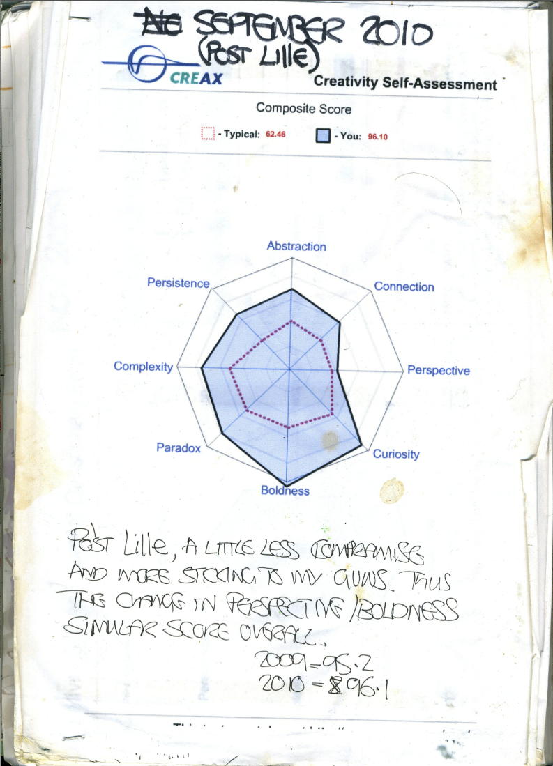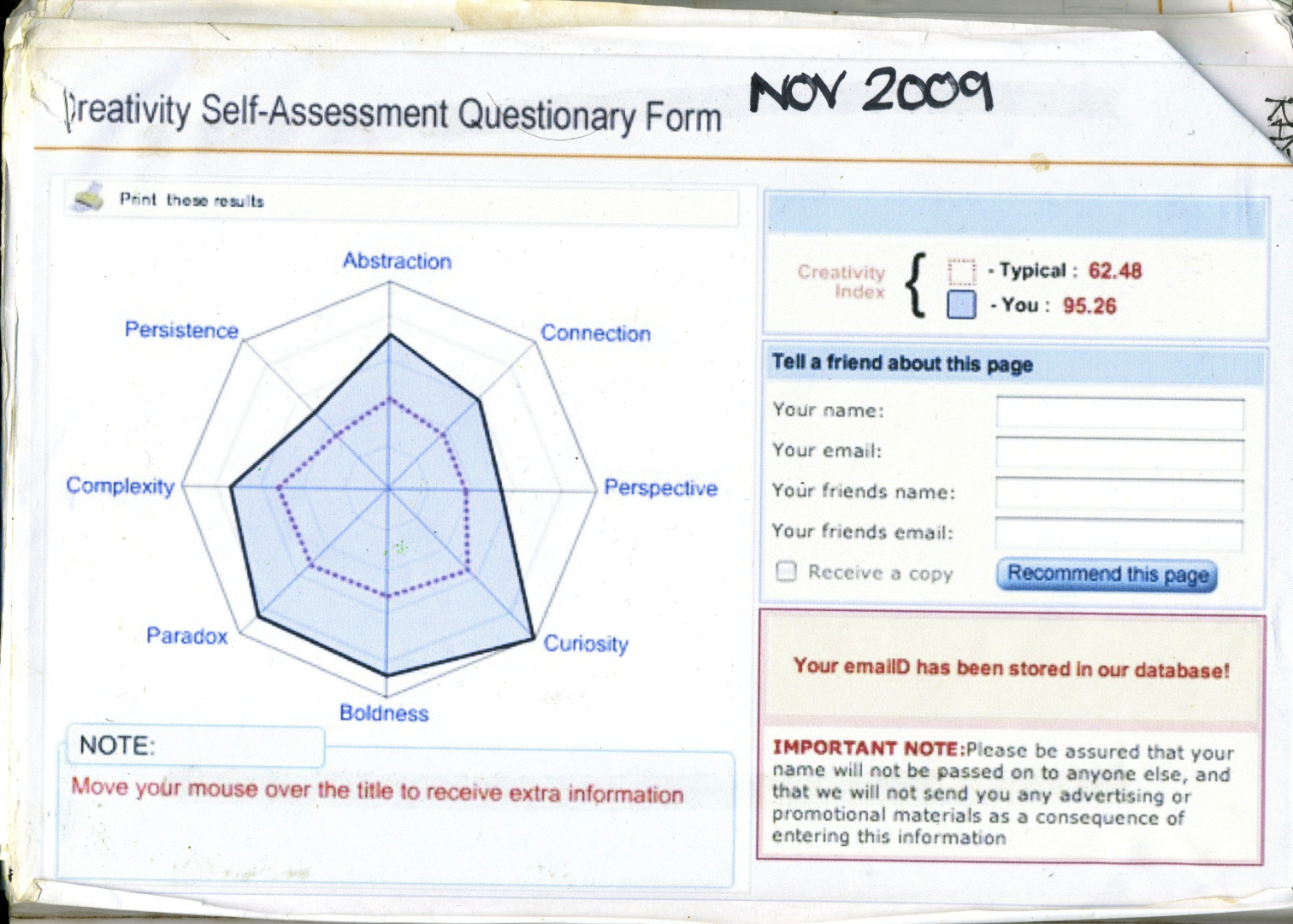 Personally I was pleased to get a high score (everyone likes doing well in tests) but I still don't see how these things can be measured. I've spent my whole life with crazy ideas buzzing around my head but with very little product and LOTs of frustration and anguish. So: whilst I might score well on this, other skills like patience, dedication, motivation, organisation and… uh, not being mental… are lacking and mean curiosity and complexity are worthless!