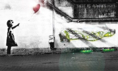 Had to a bit of work to do as the girl and balloon were facing the wrong way. Lighten wall shadow, darken footpath shadow. Drawing blended on the wall with a couple of layers to get the colour effect. Grass (a bit naff, time etc). Light, light and light to get that grundge and dreamy contrast.