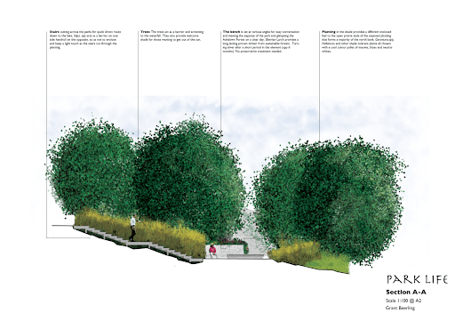 Sways of planting in an informal manner. Benches at junctions for meeting and conversation. Direct and indirect routes, you choose.