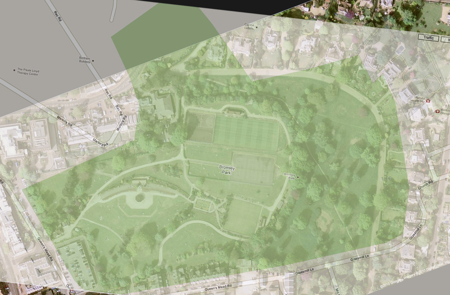 Found a park similar to Calverley, I used to live near it and the topography is very similar, so plenty of winter injuries tobogganing down the steep slope. The picture is overlaid in the same scale (no cheating, honest), with some photoshop reduction in opacity to let Calverley bleed through.